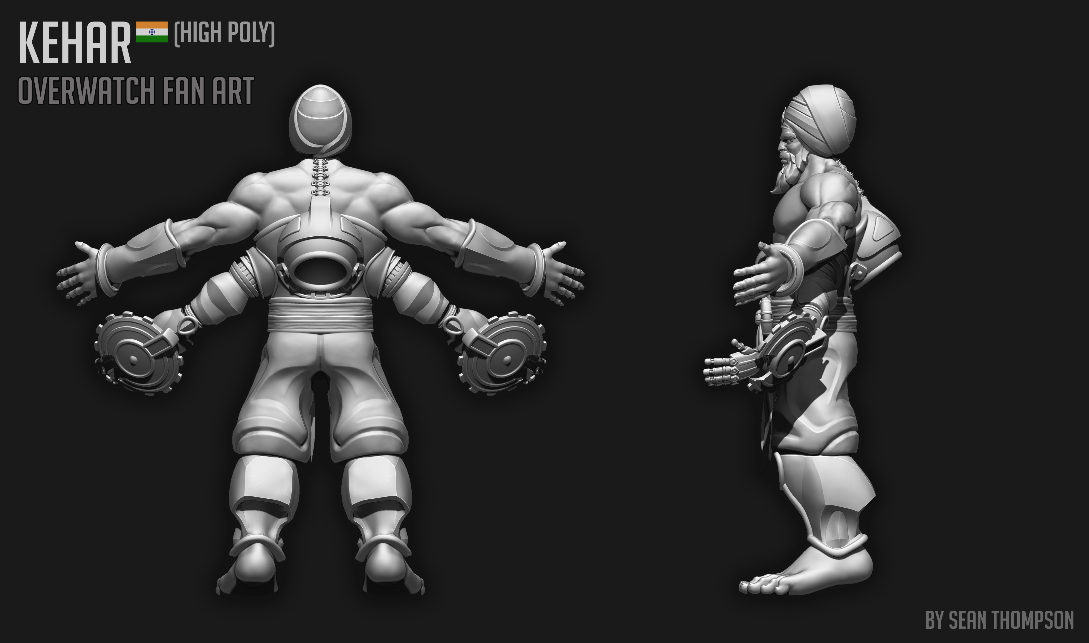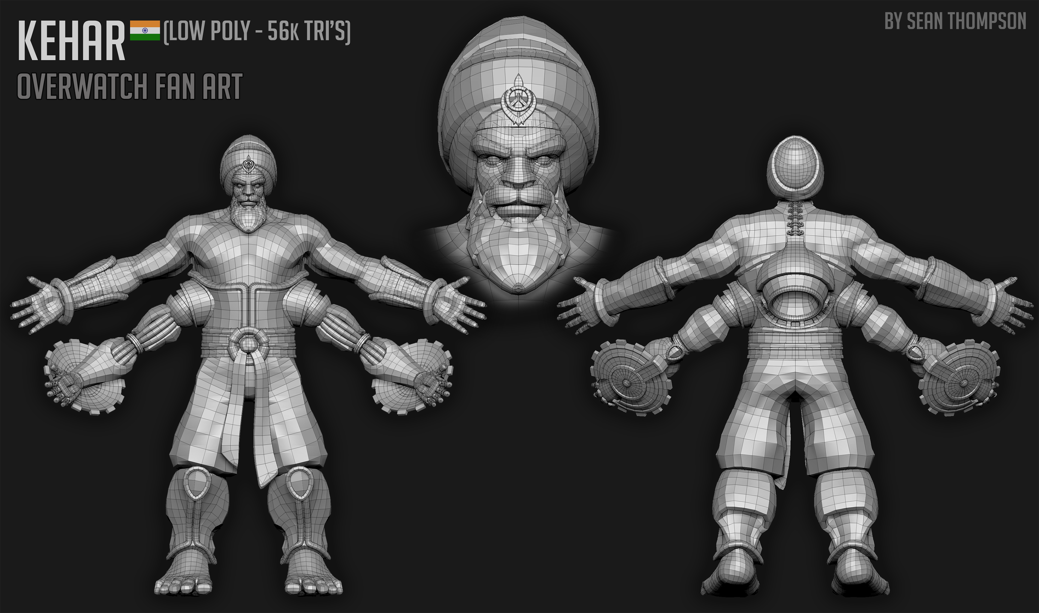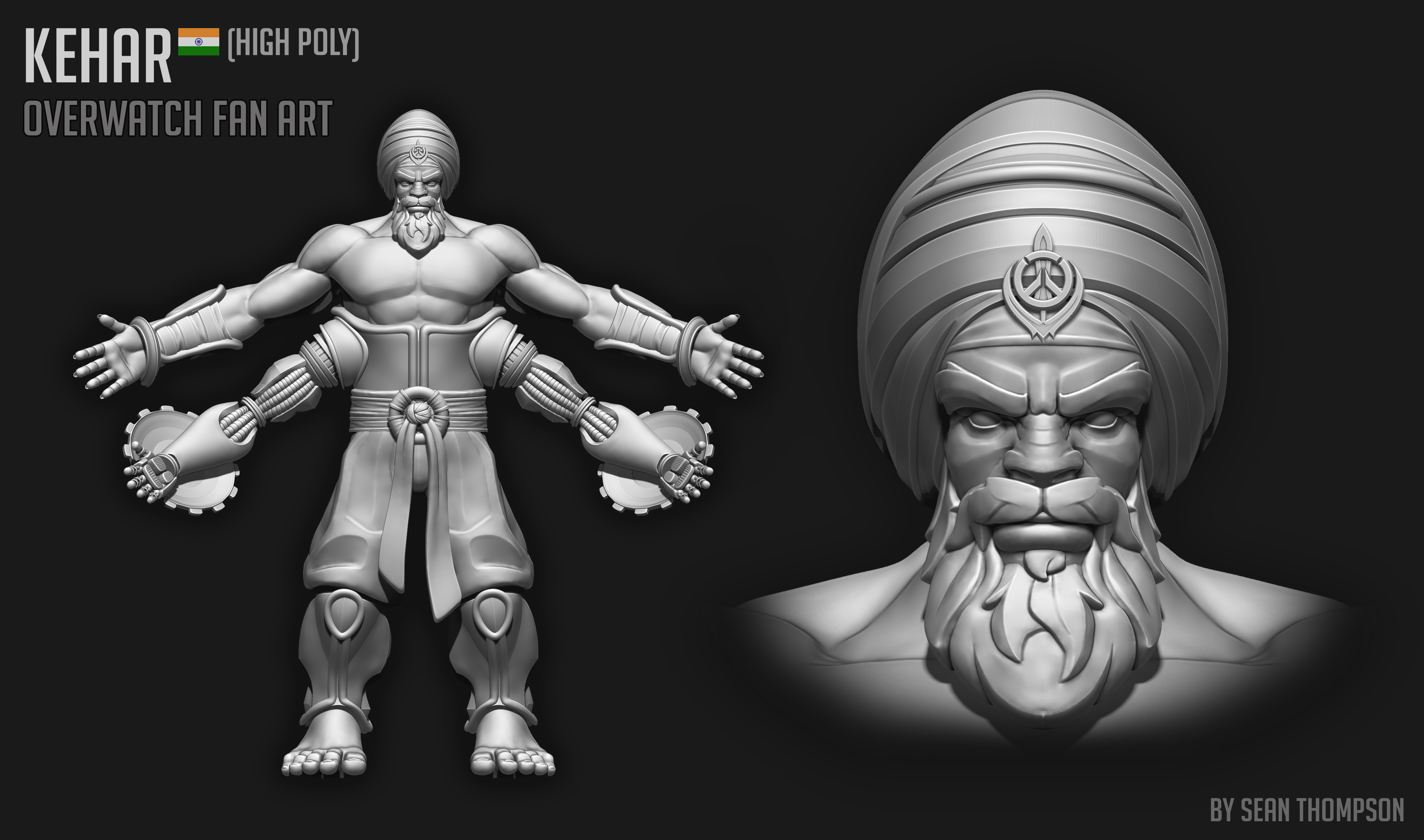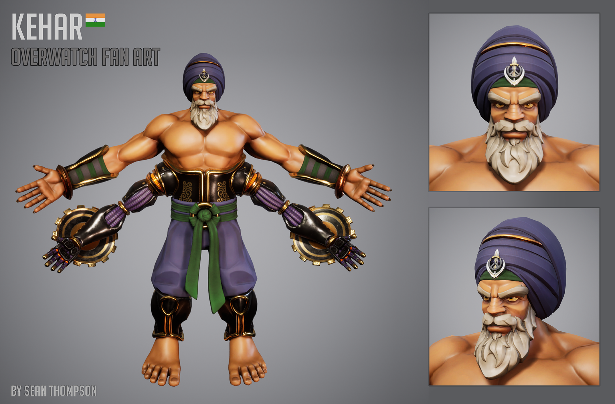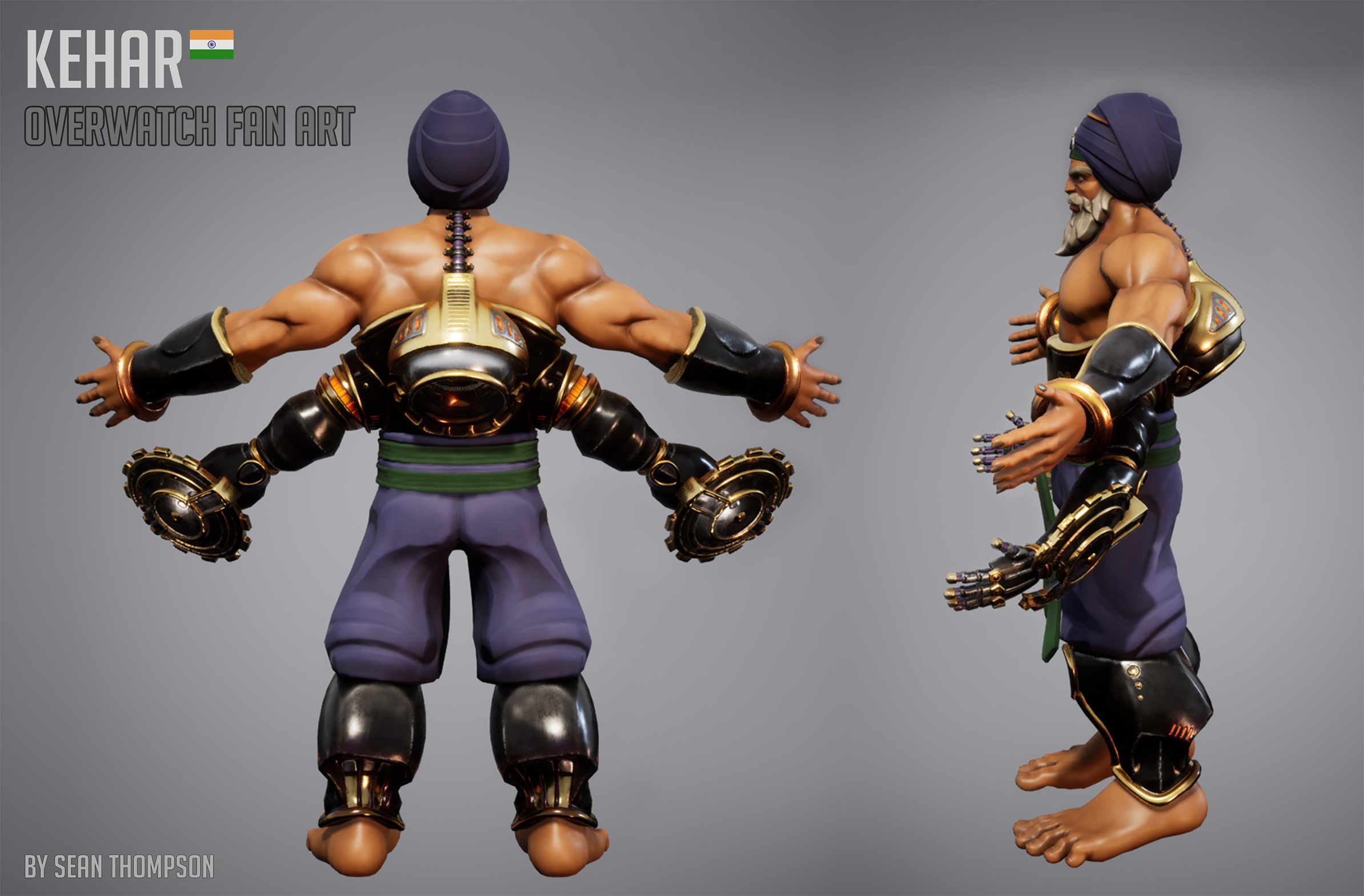 Kehar, meaning Lion; Strong man in Sikh/Indian culture, is a protagonist character created for the Overwatch universe. He is designed to bound through the air using walls to traverse the environment whilst delivering devastating combos. I aim on creating a weapon (Spear) to eventually pose the character.